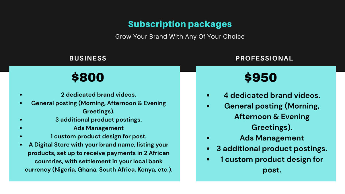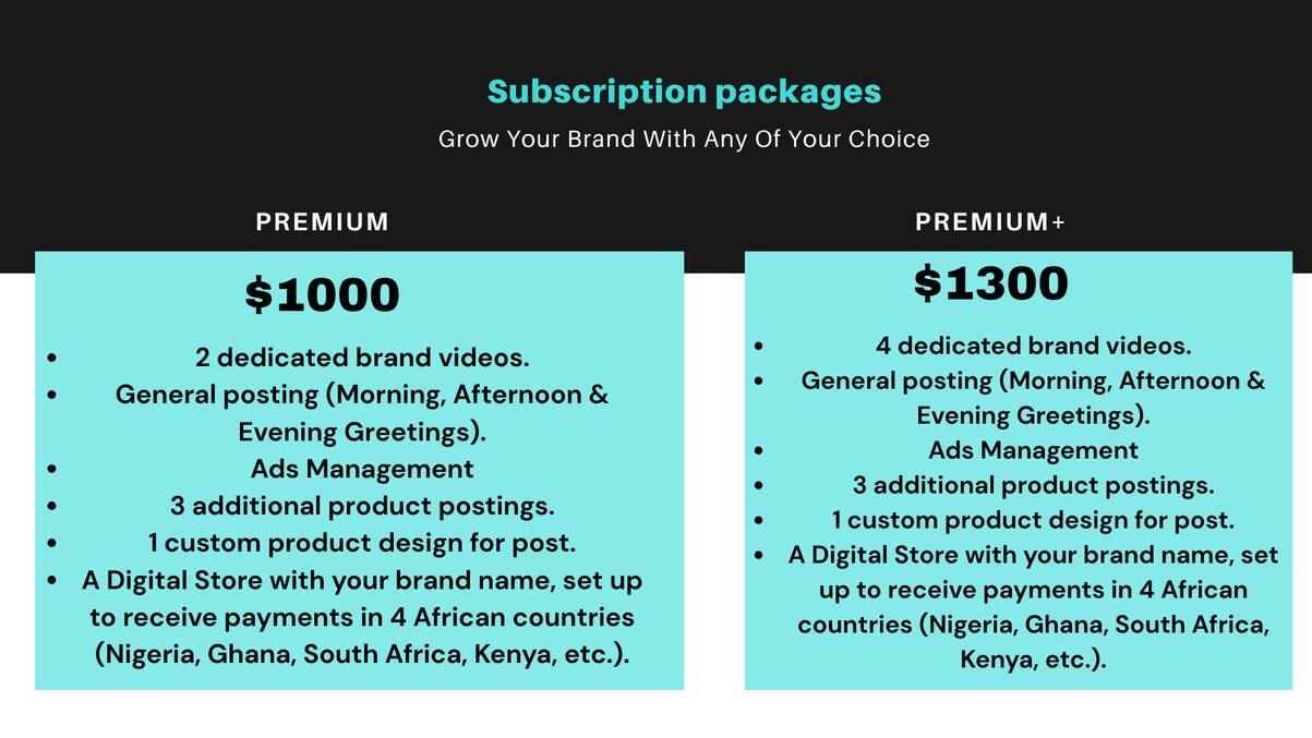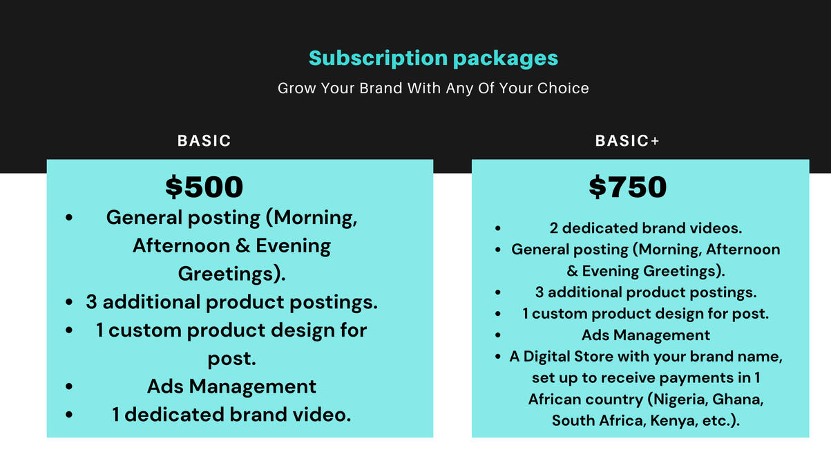 1 Clients can opt for a localized African-based digital store starting from the Standard+ package.2 Required client inputs:* WhatsApp number for submitting product details and pricing for uploading.